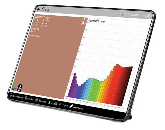 CompleXion is a handheld spectrophotometer designed to analyse skin with exceptional precision. Using advanced spectral measurement technology, it captures how light is absorbed and reflected across the visible spectrum to deliver accurate, objective skin data.
