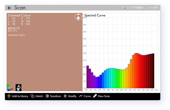 CompleXion uses advanced optical analysis to measure how light interacts with the skin. By analysing reflected wavelengths across the visible spectrum, the system identifies skin tone, undertones and subtle colour variations with exceptional precision.